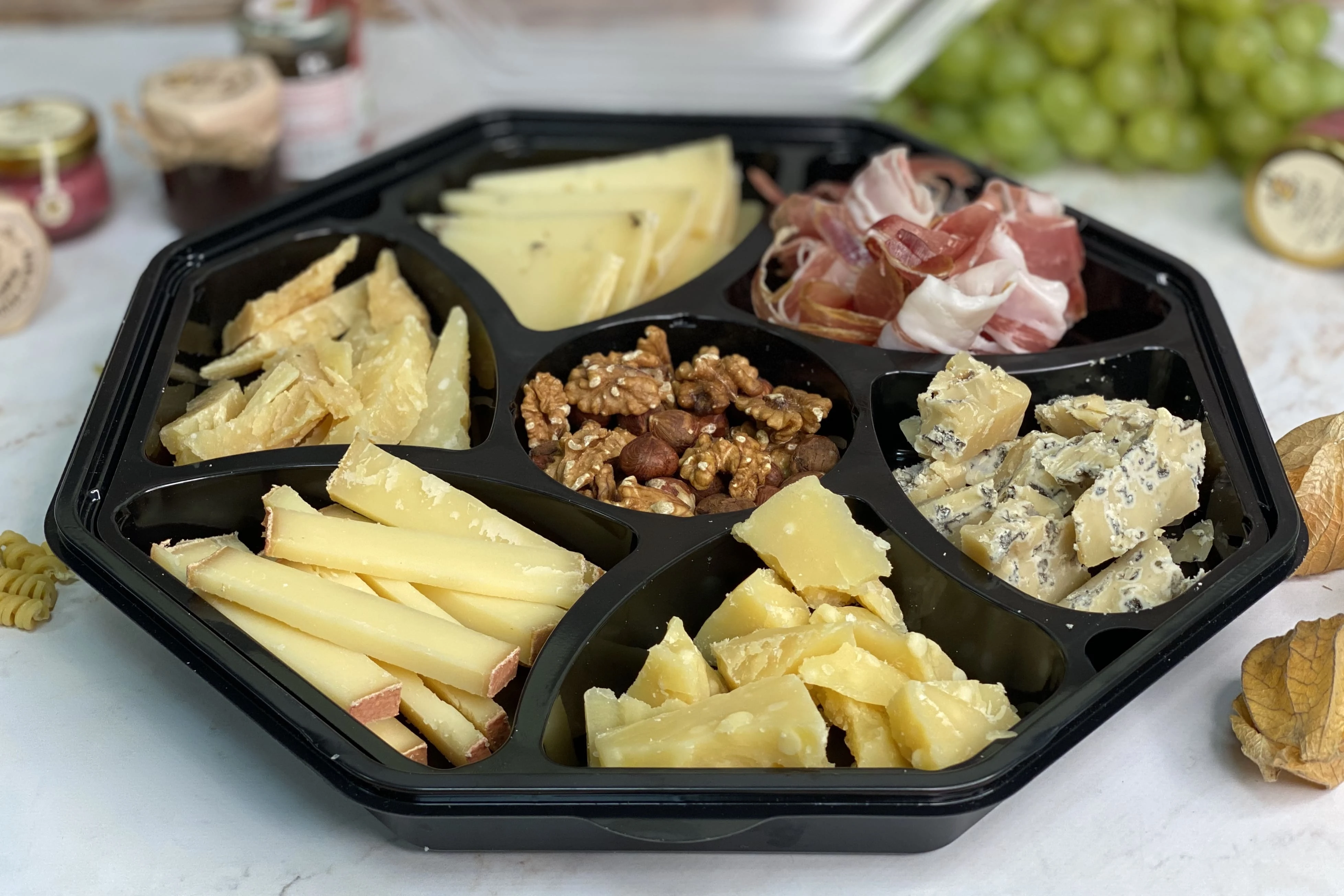 Сыры и мясная нарезка укладываются в менажницы с глубокими отсеками, которые не позволяют продукции перемешаться между собой.