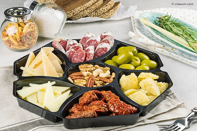 Сыры укладываются в менажницы с глубокими отсеками, которые не позволяют продукции перемешаться между собой.