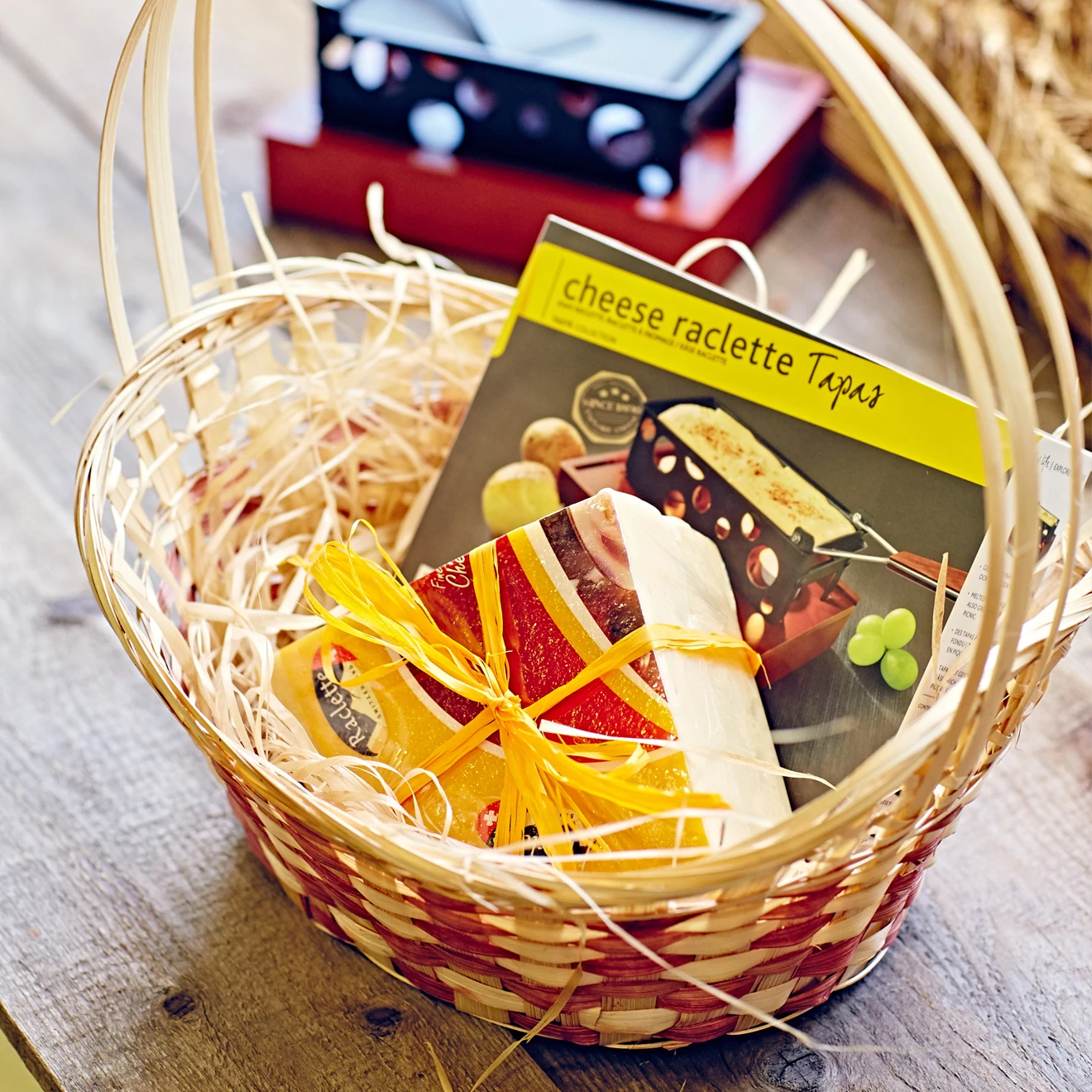 В корзину мы кладём ¼ головы сыра Раклет и раклетницу — настольный металлический мини-гриль на свечах голландской фирмы Boska® на деревянной подставке.