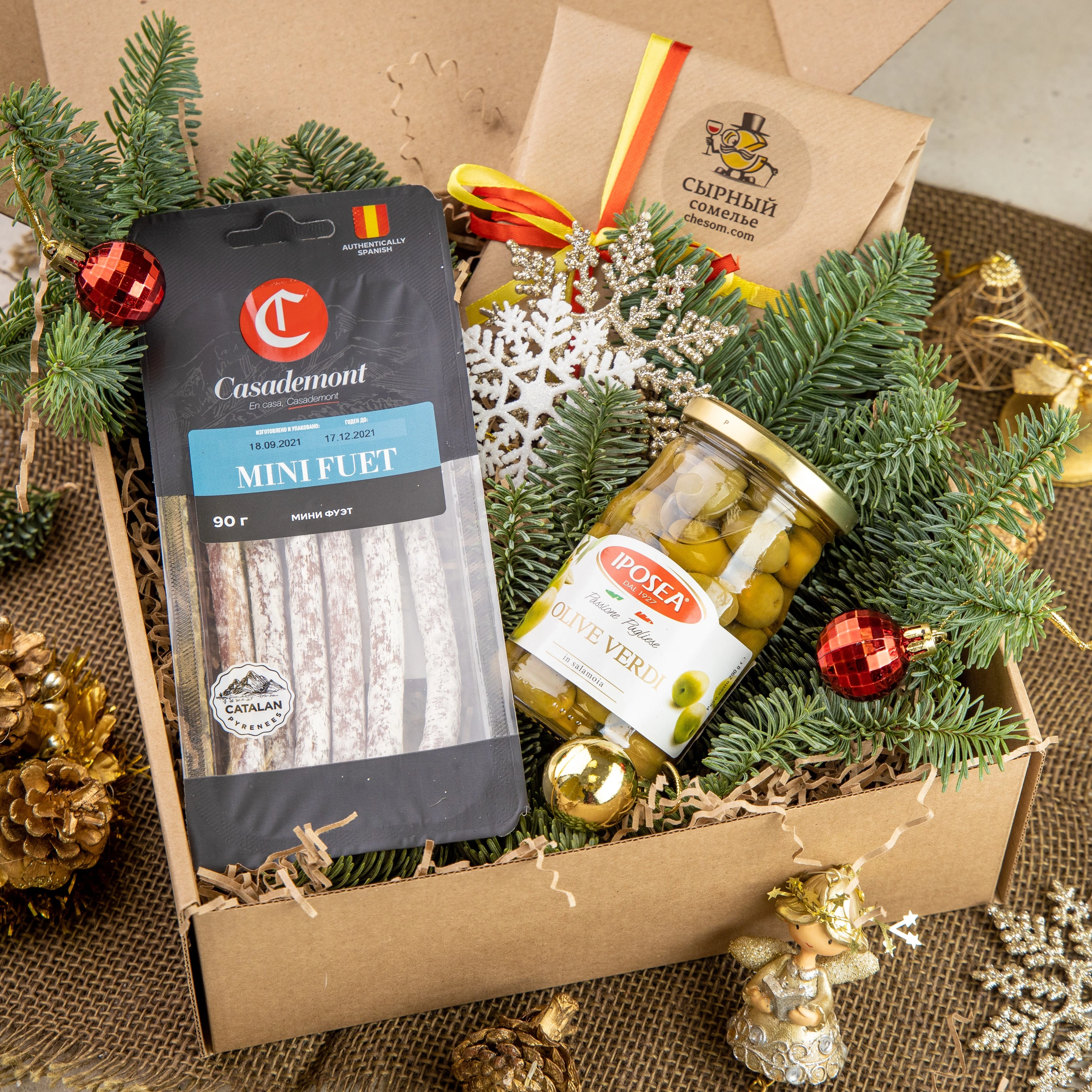 Подарочный гастрономический набор, упакованный в крафтовую коробку и украшенный новогодним... еще