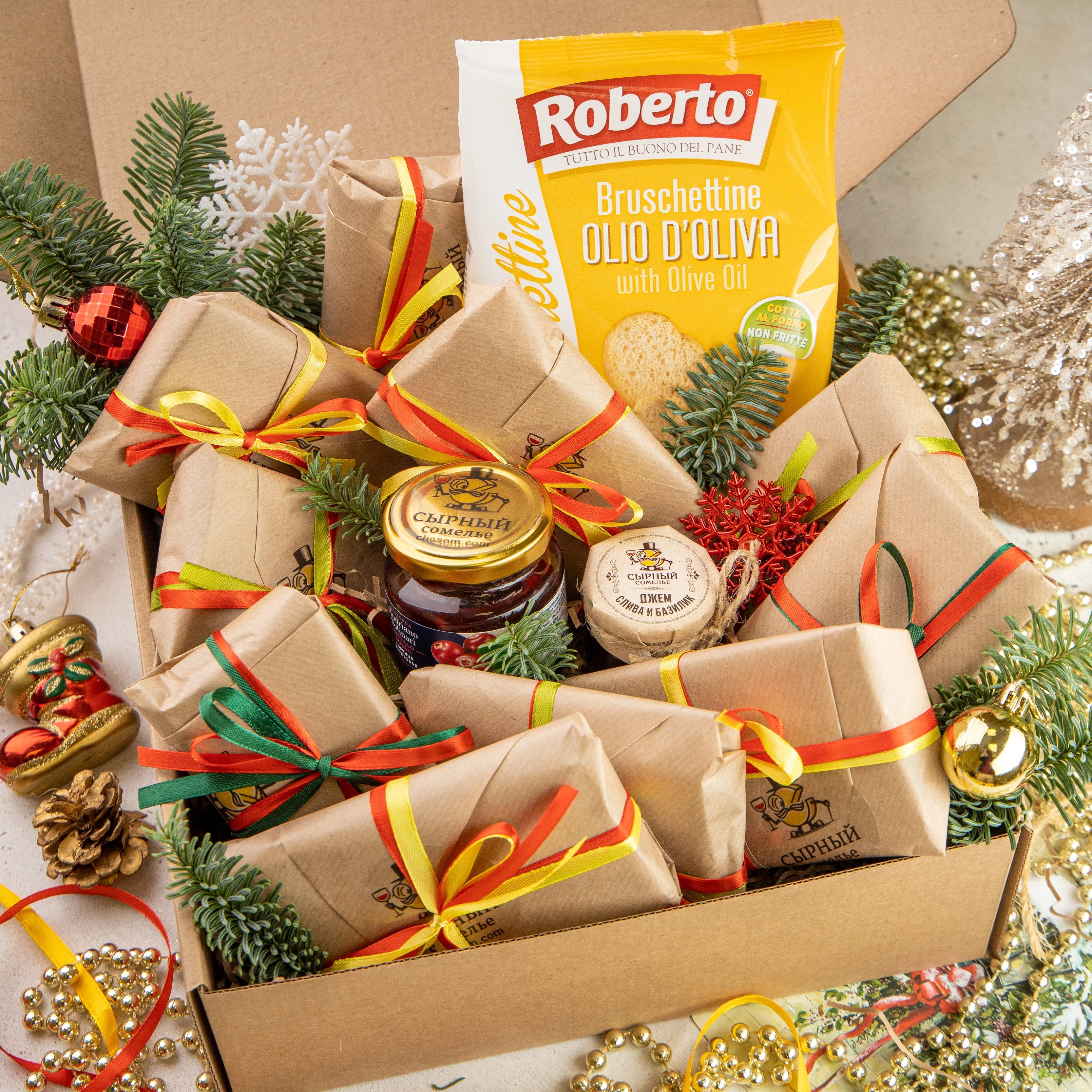 Подарочный набор с тремя видами сыров и фирменным джемом в праздничном оформлении