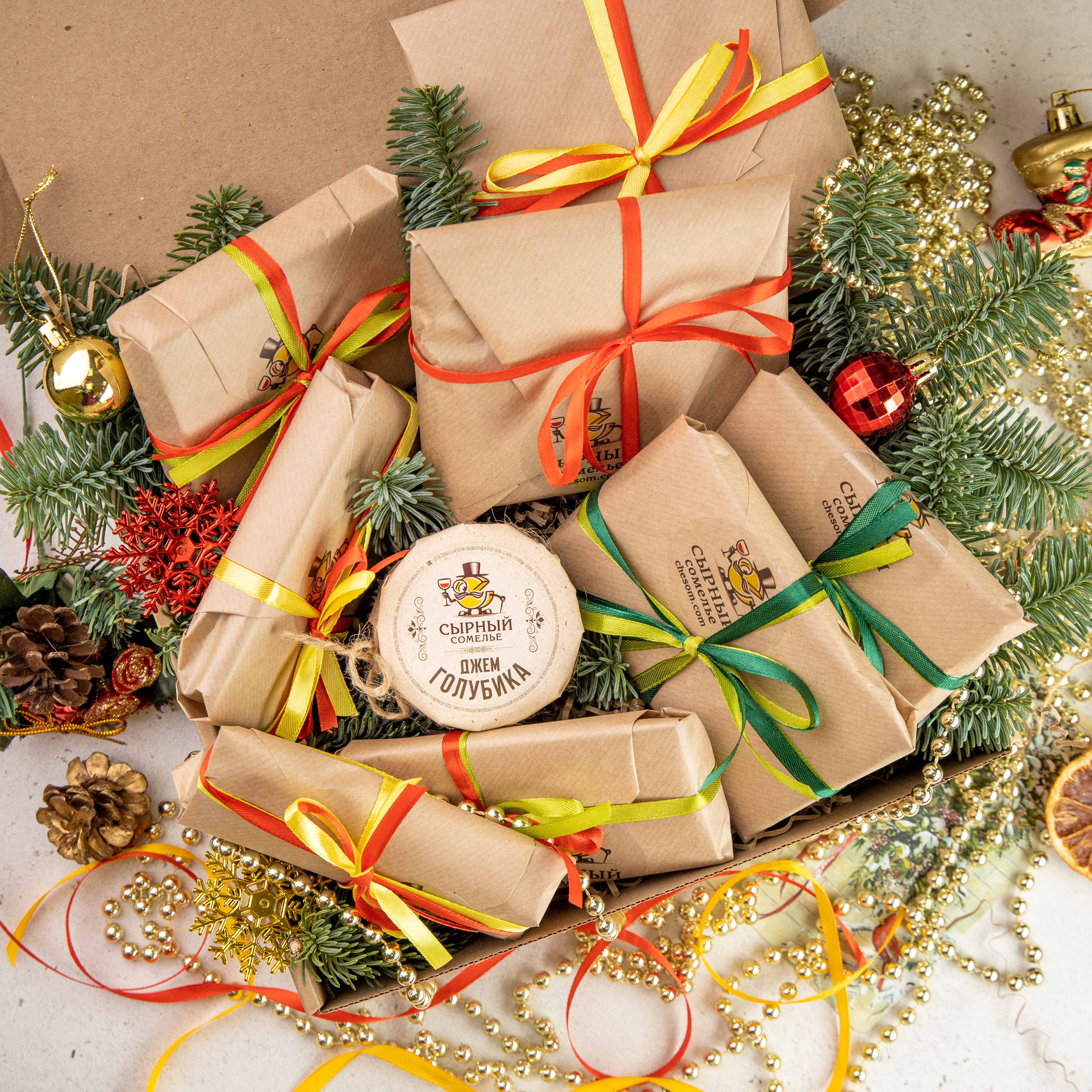Подарочный набор из 4 сыров, упакованный в крафтовую коробку и украшенный новогодним декор... еще
