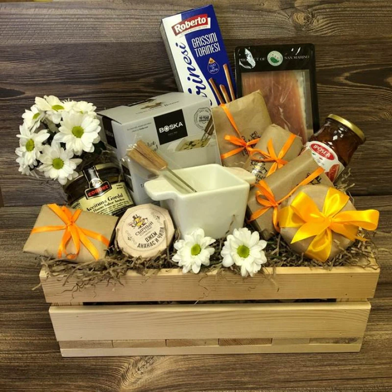 Подарочный ящик: одиннадцать видов сыров, итальянский соус для сыра и набор для Фондю: